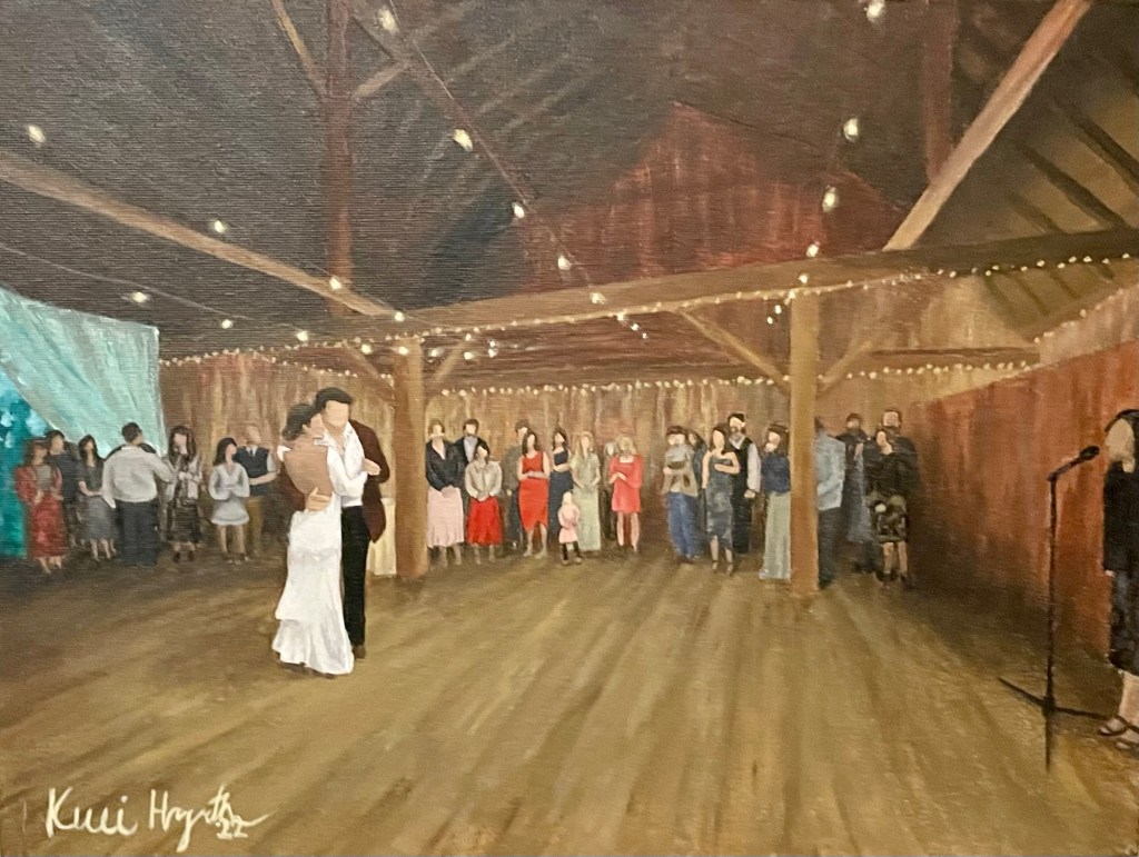 Prior to your wedding, we’d set up a meeting and talk through what you’d like for the painting. We would decide the scene (first dance, ceremony, speeches, etc.) and then I’d take any requests such as color preferences (soft pastels, vibrant colors) or anything else like if you want lots of guests in it or focused on just you two.